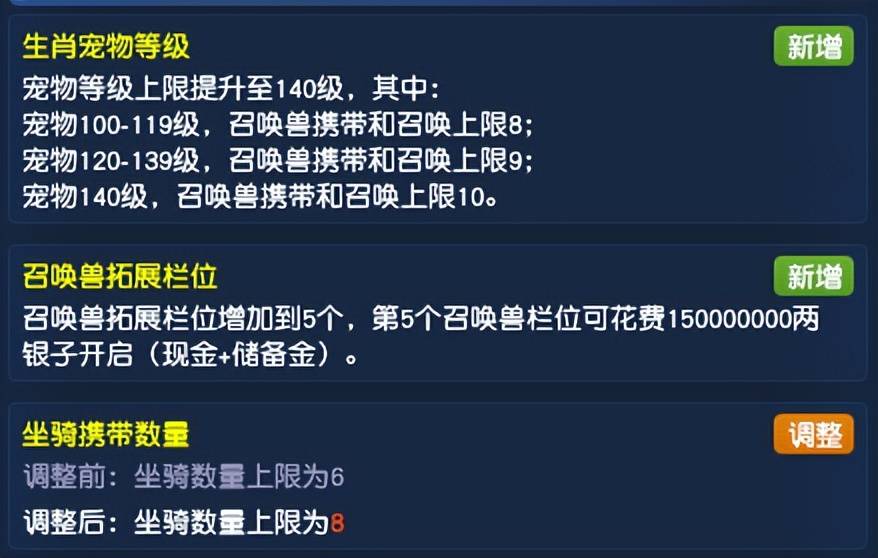 召唤兽携带和出战方面也进行了一定调整,当生肖宠物等级为140级时,召唤兽携带和召唤上限为10只,当宠物等级为120-139级时,召唤兽携带和召唤上限为9只,当宠物等级为100-119级时,召唤兽携带和召唤上限为8。