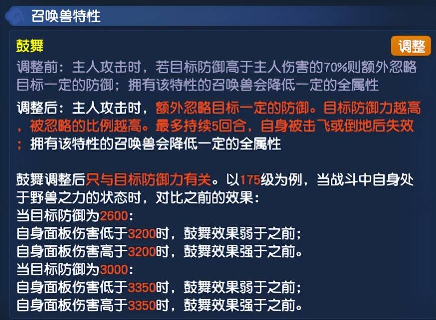 召唤兽鼓舞特性由之前的在场就有变为了持续五回合,自身被击飞或倒地后失效,且只与目标防御力有关。以175级为例,当目标防御为2600,自身面板伤害高于3200时,鼓舞比之前强;当目标防御为3000,自身面板伤害高于3350时,鼓舞效果比之前强。不过,各位小伙伴只要面板伤害超过3100,在不被放下的情况下,基本不用太过担心。