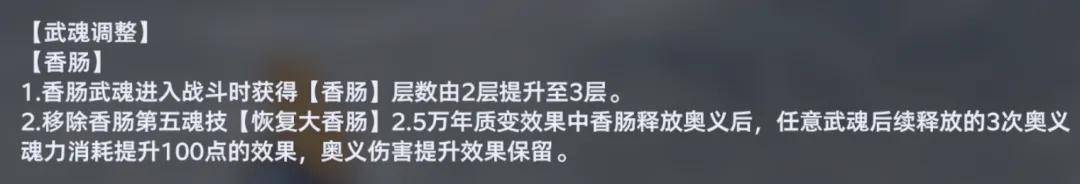 然后第三个调整是有关于奥斯卡的,那么作为三大普池稀有武魂之一,之前的比比东还曾稳居第一控制之位不短的时间,而朱竹清也随着戴沐白的上线也重焕生机,但唯独目前的奥斯卡就有点寂寥了,所以这波针对香肠的调整也是一定程度上增强了奥斯卡的辅助能力,而且这波对于奥斯卡的加强还不是终点,马上大家就应该会看到第二步了。
