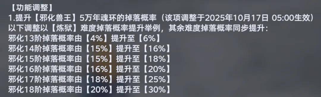 首先大幅提升5万年魂环的掉率这个事是没啥问题的,目前即使大家到了59级去刷这个5万年魂环,一天就算刷他个5次,一个5万年间魂环都不掉那也太正常了,甚至连着两三天都不掉......也是经常发生,所以在这么个官方要大力推动6、7、8、9等等更高年限魂环的大版本趋势下,给玩家更多的5万年魂环来源那就非常正常了,因为过不了多久很多魂环的10万年质变效果也会成为官方平衡性调整的一大利器,而之前部分神赐魂环的10万年效果已经被爆了出啦,有留意过的朋友相信还是有印象的吧。