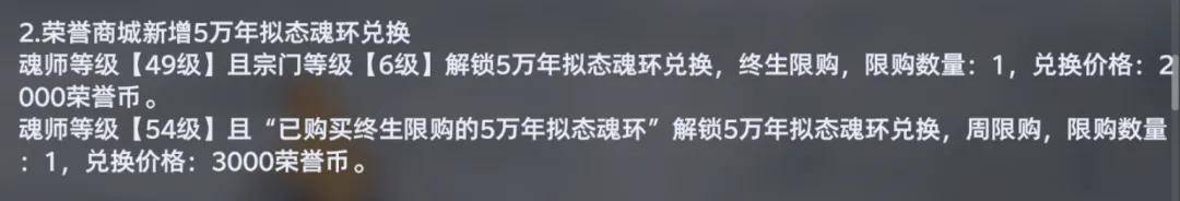 然后第二个调整也是有关于5万年魂环的,在宗门商店中新加入了5万年魂环的一次性兑换和每周兑换,这个无疑也会成为近期大家更有欲望去兑换的一个选项,而相反这个操作也是官方刺激部分玩家去购买大月卡的一个方案,因为买了大月卡的玩家每周可以获得荣誉币的速度和上限都会有提升,所以让荣誉商店变得更有吸引力也是变相促销大月卡的一个手段。