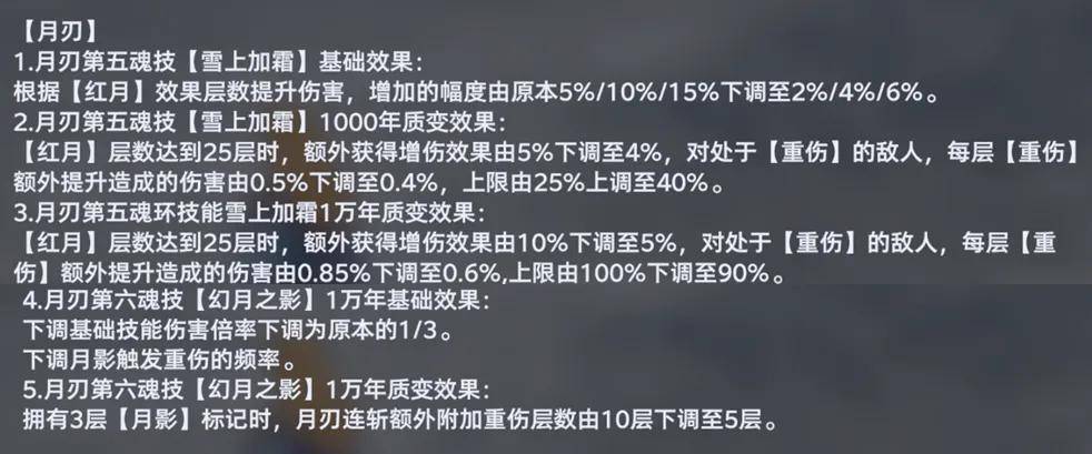 然后是第四个针对邪月的调整,调整项一共有5个,大体上都是针对削弱方向的调整,那么很多朋友在看完之后也不知道具体这个调整会对邪月造成多大的影响,因为之前就在做XXX的测试,所以刚好之前维一对邪月有过一些长图的测试结论,而昨天经过调整之后大致邪月的长图(指4-6分钟)伤害会有50%左右的削弱,这个幅度在维一测过的所有调整中应该是相当之高的了,那么为什么官方要做这种看似有点让人摸不着头脑的调整呢?其背后的一个非常明显的信号就是,如果不调的话那么即将上线的风笑天+邪月在长图中的表演可能就会有些超纲了......