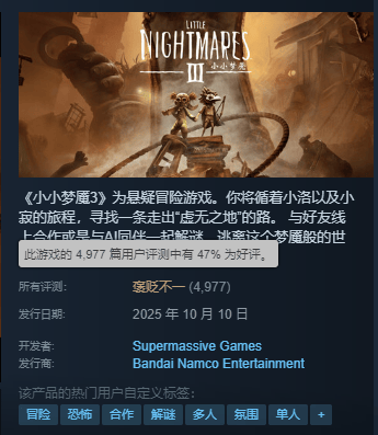 在游戏一代和二代在Steam上均维持90%以上好评率,近50000条评测的良好口碑基础下,该系列的最新作《小小梦魇3》于6天前正式发售,但意想不到的是,目前游戏好评率仅为47%,维持在“褒贬不一”阶段。