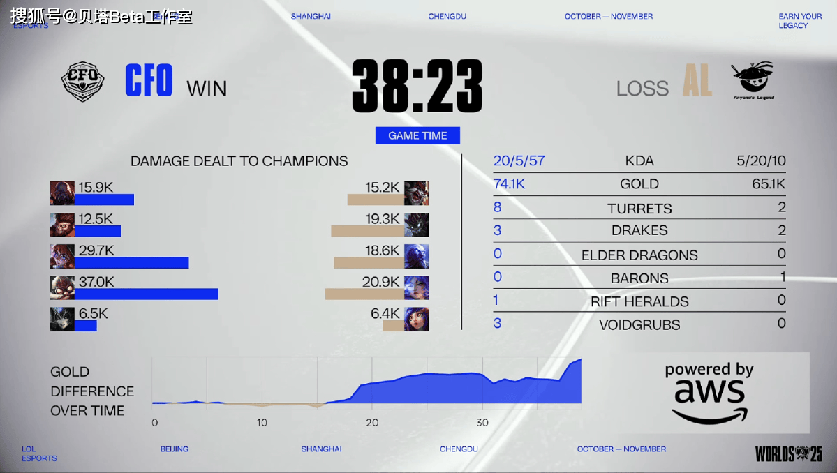 中期21分钟CFO主动打厄塔汗,圣枪哥挖掘机TP过来,冲散CFO阵容,AL团灭CFO后,拿下厄塔汗。28分钟CFO鳄鱼被打残,AL拿下炼金龙魂,29分钟CFO野区埋伏,doggo女枪开R,但是被打断,AL打出完美团战团灭CFO后,拿下比赛的胜利。