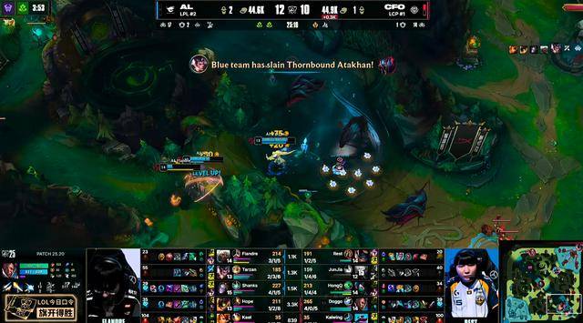 前期两队打的十分小心,并没有爆发激烈的对抗,AL率先拿到一血,并连续控下两条小龙。CFO在15分钟抓死Shanks瑞兹,成功控下峡谷先锋。CFO利用先锋推掉AL的中一塔,随后双方在河道爆发团战,Junjia猴子的分身骗出AL三个大招,CFO团战大获全胜顺带控下小龙。