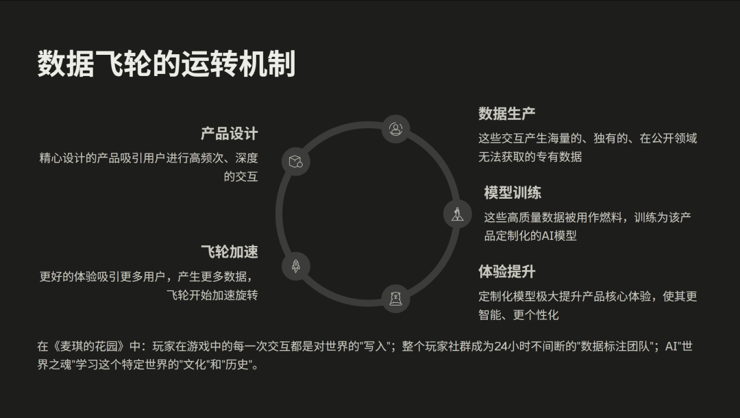 更好的体验又会吸引更多用户,带来更多数据,让飞轮加速运转。玩家的每一次行为,都是对我们游戏的贡献。就像玩家在游玩时,系统有一个 24 小时不间断的数据流,去帮助 AI 背后的“世界之魂”理解这个世界的运行逻辑。