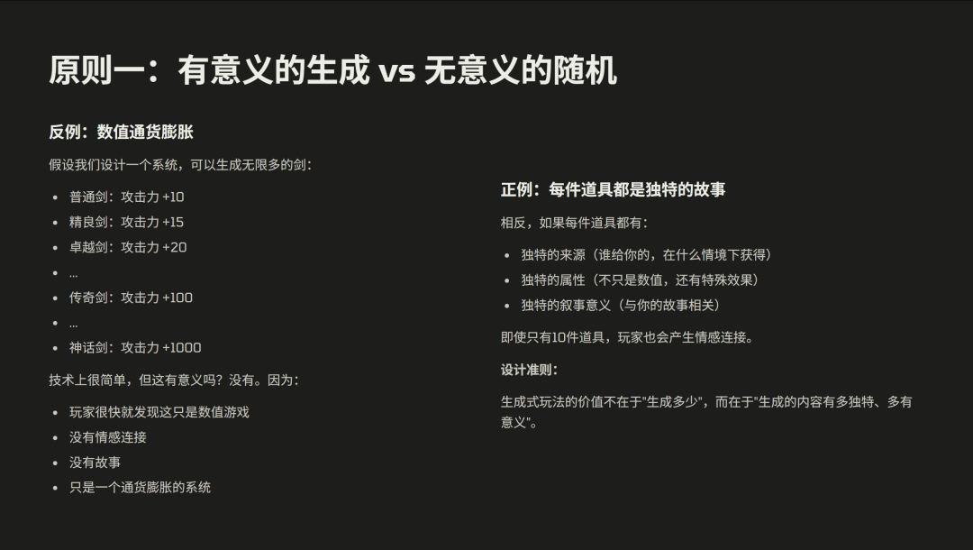 比如我们可以做一个能无限刷钱的系统,技术上很容易,但没有意义。玩家很快会发现那只是数据游戏,和游戏世界没有真正的连接,道具也没有个性,价值感就会消失,最后只会变成一个通货膨胀的系统。