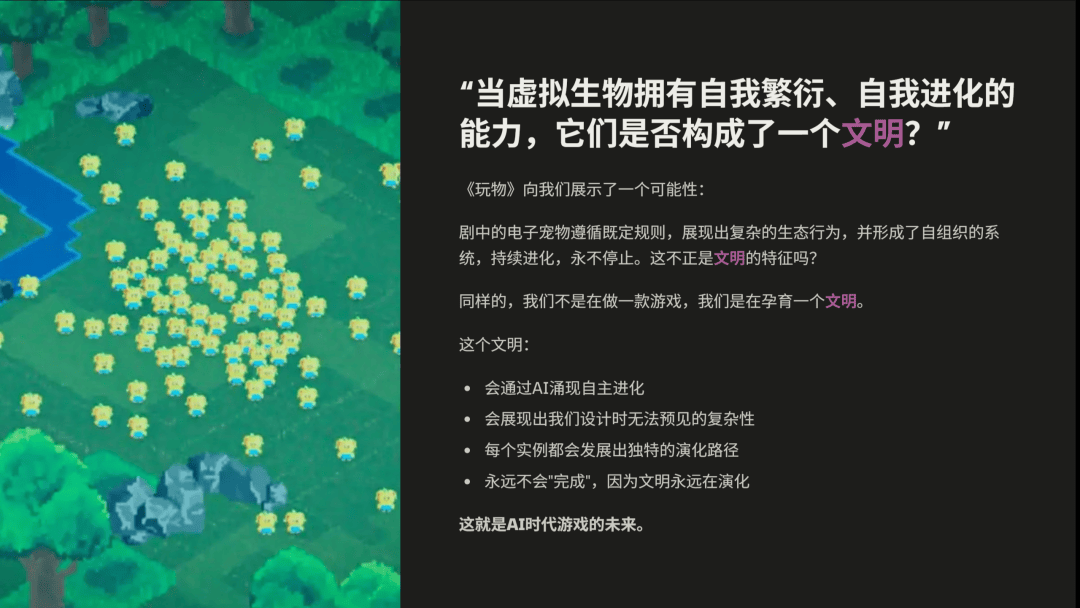 这就像是一场永无止境的军备竞赛。我们不停地做加法,但从未问过一个根本问题:能不能让游戏成为一个自我生长的生命体?能不能通过 AI 涌现,让游戏世界自己进化成一个文明?