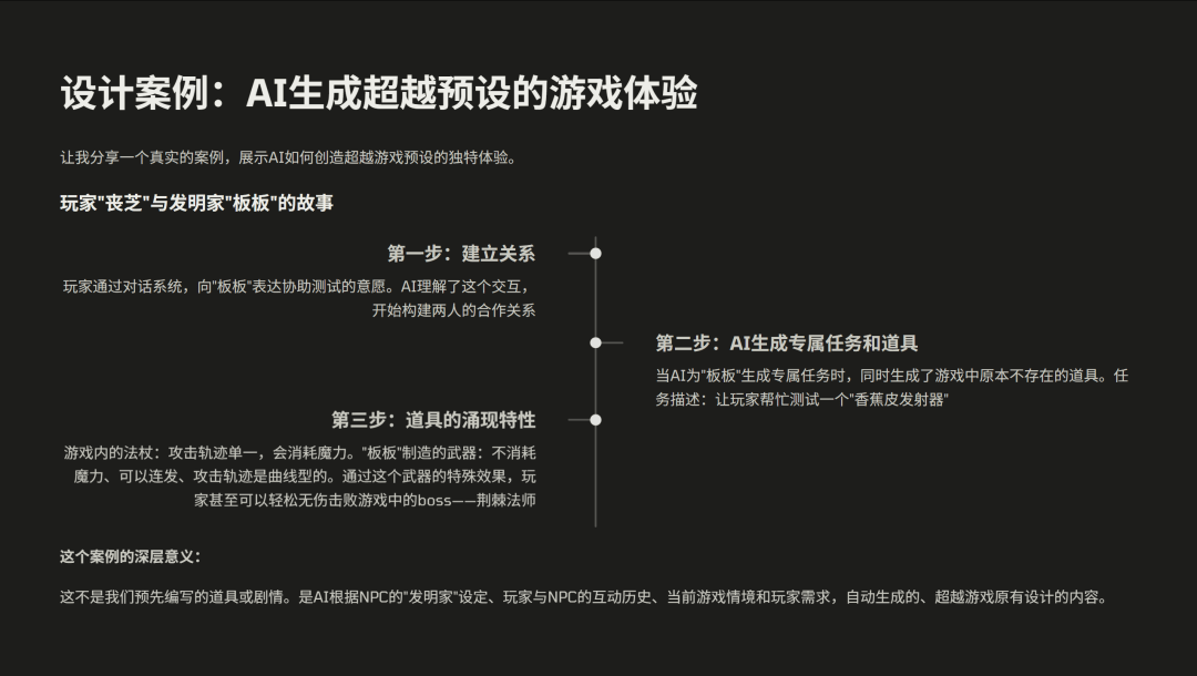 在前面的视频里我们提到过,在某次玩家测试中,有位玩家通过自己的描述生成了一个 AI 角色“发明家”。这个角色有非常鲜明的性格特征,而系统在后续任务中会依据这个角色设定,为玩家提供原本预设之外的强力道具。