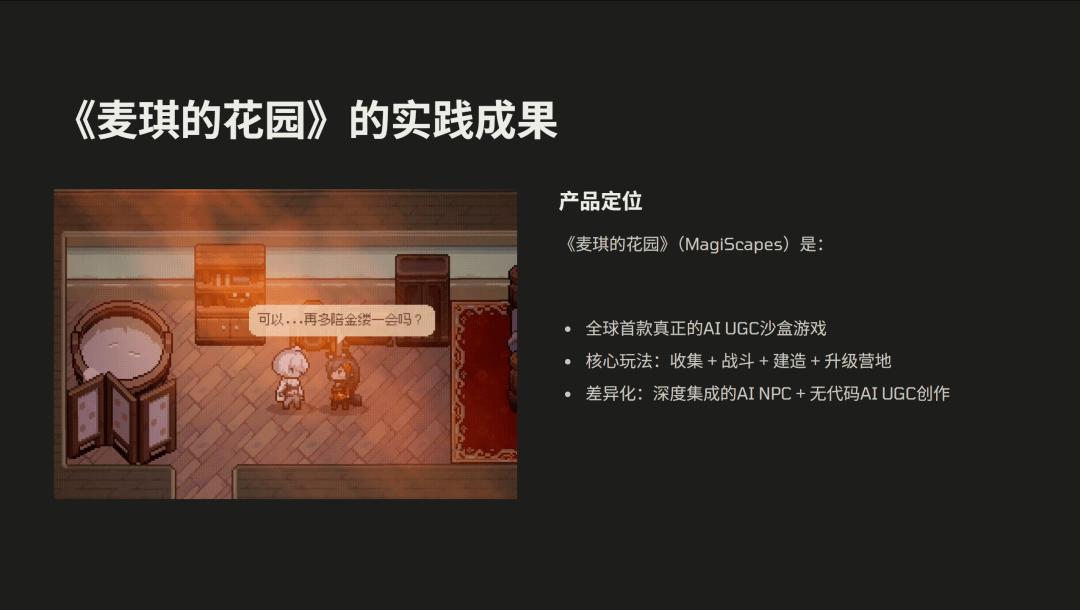 从数据的验证来看,我们有 83% 的玩家认可 AI 陪伴的一些玩法,玩家平均游玩时长超过传统的沙盒游戏 50%,社区 UGC 内容是我们当时预期的 4 倍左右。