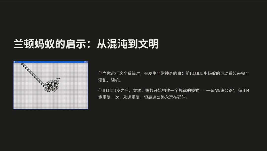 而且这条高速公路会以固定的节奏一直延伸下去,蚂蚁每 104 步就重复一次动作,仿佛进入了某种秩序状态。惊人之处在于:没有人设计过这条高速公路,规则里也没有任何关于构建秩序的描述。