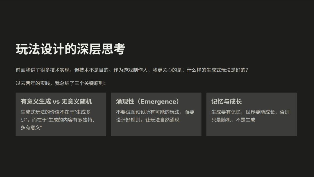 第二,涌现性。我们不去假设所有可能的玩法,而是设计规则,让 AI 和玩家在对抗中自然涌现新的内容。