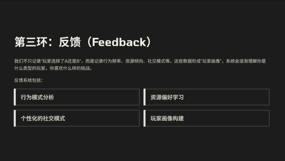 通过这些维度,系统会形成一个清晰的玩家画像,理解你偏好的挑战类型和内容类型,并生成“对你来说有趣的”生成体验。