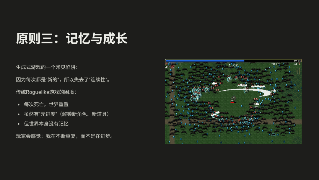 接下来的原则是“记忆和成长”。肉鸽游戏的一个常见陷阱在于:每次重开都是新局,缺乏延续性。很多游戏中,玩家死亡后世界归零,虽然每次可能都有进步,但世界本身是静止的。久而久之,玩家会感觉自己只是在不断重复,而不是在真正成长,最终会觉得无聊。