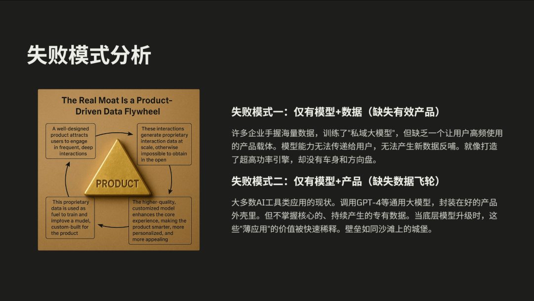 有一些 AI 创业公司做所谓的私域大模型的产品,但缺乏一个用户高频使用的产品载体,模型能力无法真正传递给用户,也无法产生新的数据,就像造了一个高功率的引擎,却没有车身,永远在空转。