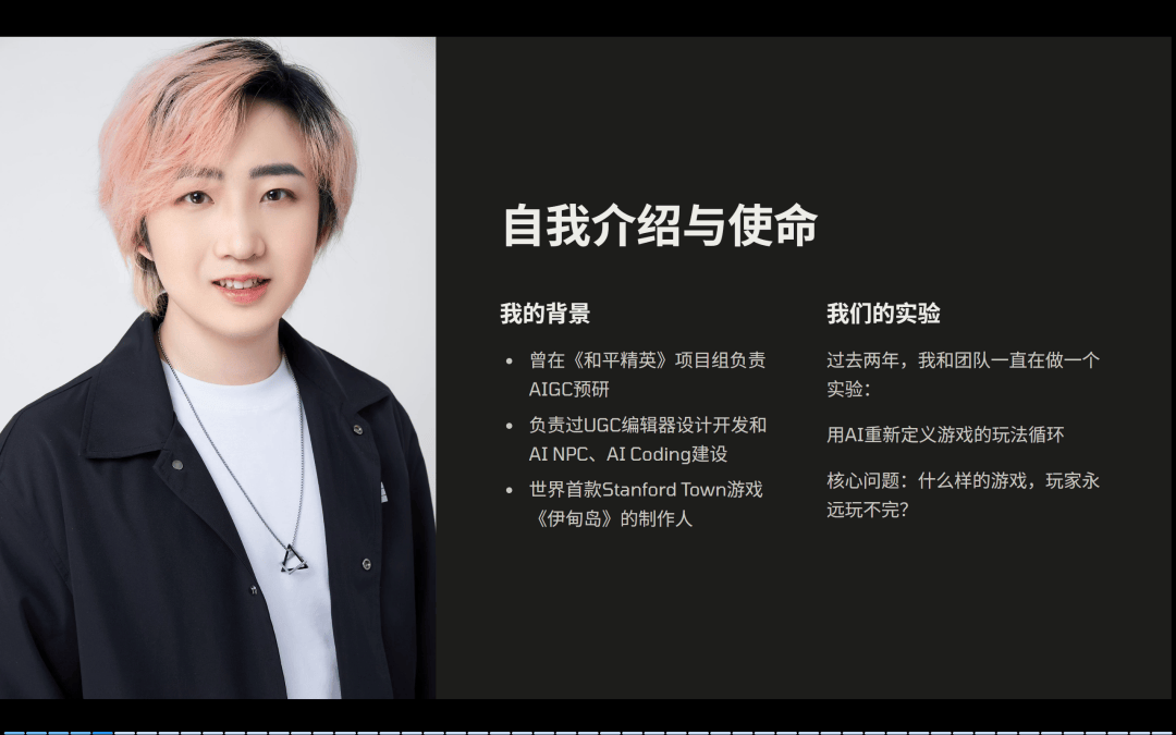 简单介绍一下我自己,我曾经在腾讯《和平精英》项目组负责 AIGC 预研,也做过 UGC 编辑器设计和 AI 工具的建设,也是世界首款 Stanford Town 游戏《伊甸岛》的制作人。