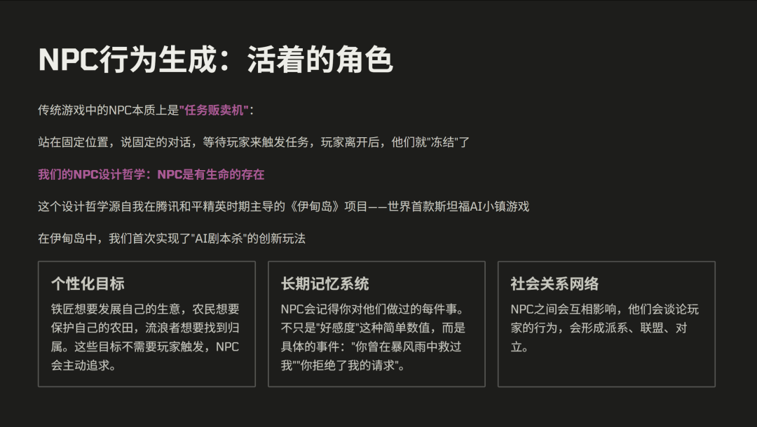 其次,是从固定世界到生长世界。不再是这个世界拥有 100 个 NPC,每个 NPC 有固定的对话,而是这个世界它有一个生产规则,NPC 会根据玩家行为和环境去改变。
