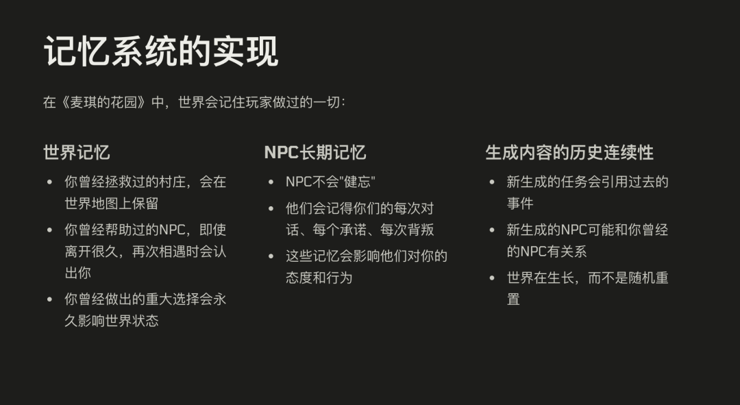 第三,“记忆和成长”。只要系统有记忆,世界就能成长;如果没有记忆,那所有内容都只是随机指令,不是真正的生成。
