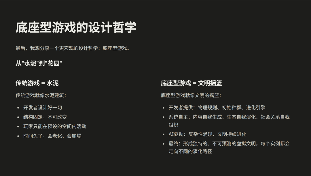 同样地,我们或许不是在做 AI 游戏,而是在孕育一个新的文明。这个文明会在规则中生长出我们预料之外的复杂性,它永远不会“完成”,因为它永远在生长。