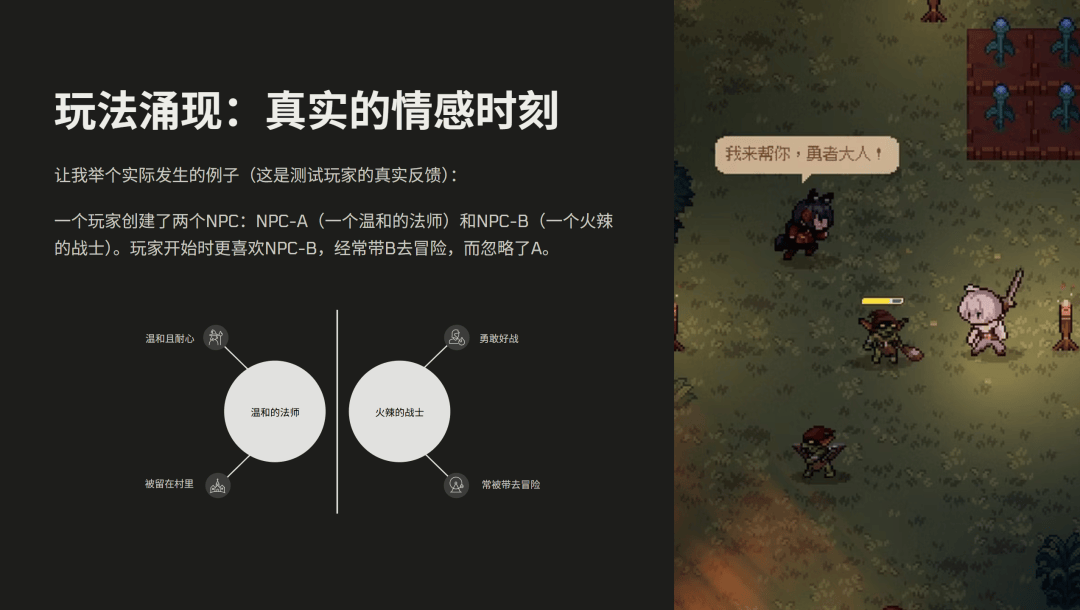 我们只设计了基本规则和 NPC 的反应逻辑,而他们的社交关系和剧情走向,都是在系统内部自然涌现出来的。所以我们的结论是:不要去预测所有可能性,而是设计好规则,让玩法自己冒出来。