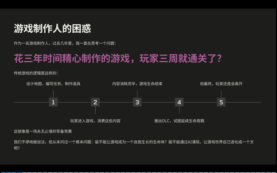 过去两年里, AI 爆发让我们看到另一种可能性,传统游戏逻辑是,开发者决定一切内容给玩家消费,随后这个内容就枯竭了,游戏从而走向死亡。