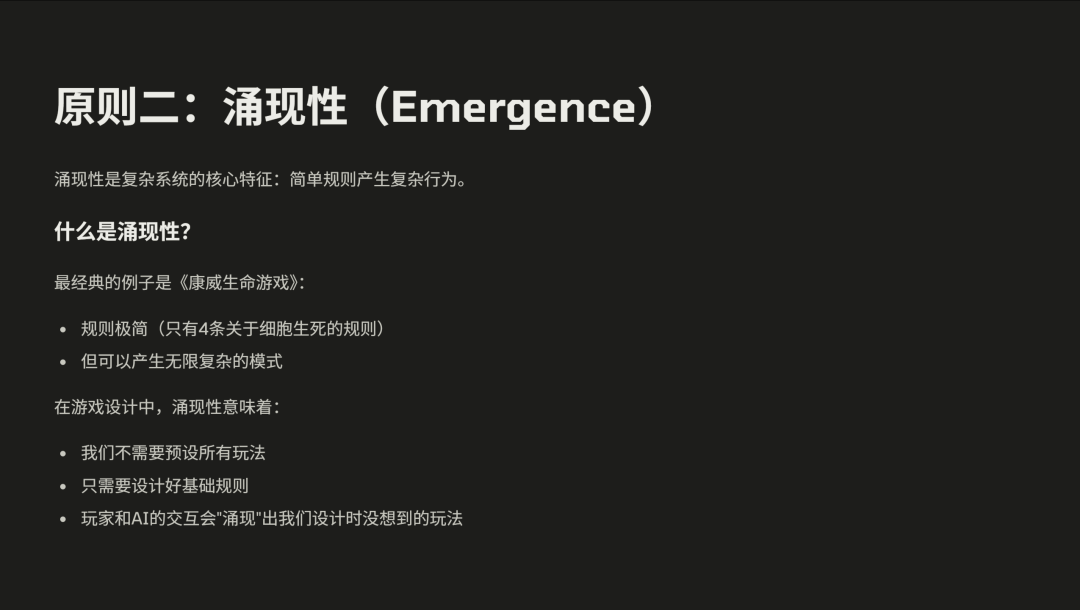 第二个原则是涌现性。听起来可能有点玄乎,但其实很好理解。它是复杂系统的核心特点——简单的规则可以产生复杂的行为。