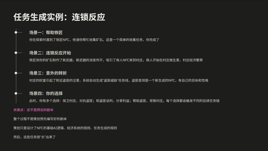 但我们认为,生成式的任务是不一样的。在我们的游戏当中,我们设计了一套任务生成的系统,AI 会实时分析玩家的状态,包括他的资源,他的社会关系,还有他的位置,结合他的目标和世界的当前的状态,动态地生成任务。