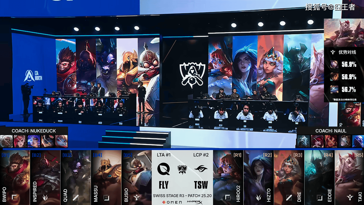 第一局比赛,FLY蓝色方,禁用:安蓓萨、蔚、芸阿娜、兰博、波比,选用:Bwipo塞恩、Inspired猴子、Quad沙皇、Massu飞机、Busio牛头;TSW红色方,禁用:瑞兹、发条、岩雀、霞、维克托,选用:Hiro02铁男、Hizto奇亚娜、Dire阿萝拉、Eddie卡莎、Taki洛