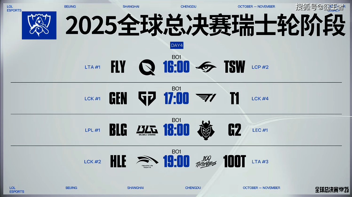 经过前三轮的较量,16战队之间的强弱,已经有了大概的体现。特别是第三天TES爆冷0-2负于KT。那么第四天的比赛,就轮到1-1组,G2对阵 BLG,GEN对阵T1,TSW对阵FLY,100T对阵HLE。他们会带给什么样的惊喜,让我们一起来期待一下吧