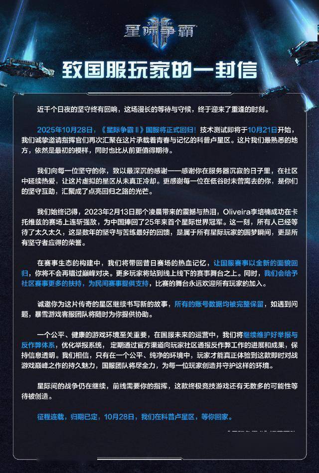 《星际争霸Ⅱ》国服将于2025年10月28日正式回归,公开技术测试将于2025年10月21日开启。如果想要找回或者修复您的《星际争霸Ⅱ》国服账号,请继续阅读以了解常见问题。