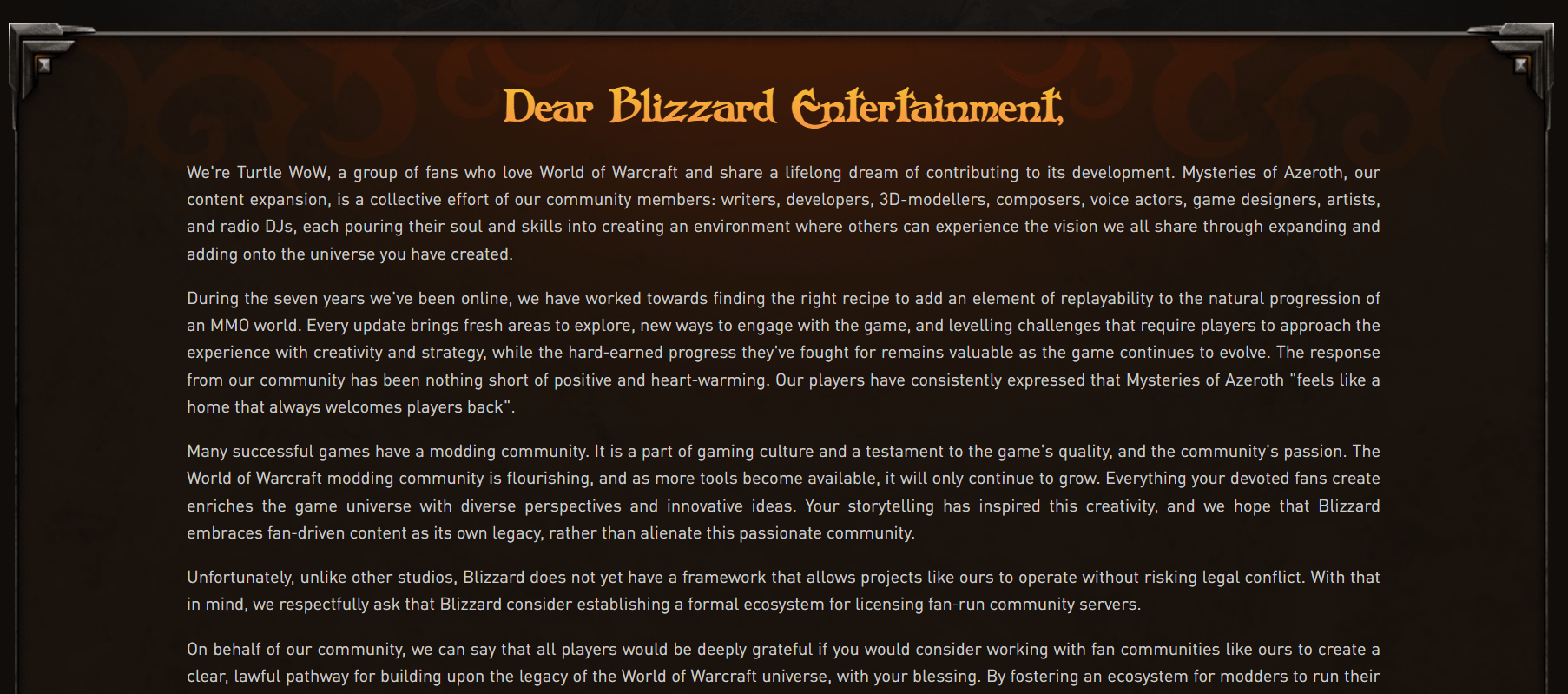 在无视暴雪的警告之后,《魔兽世界》乌龟服团队甚至主动出击,他们在10月17日发表一封致暴雪的公开信,为粉丝自制Mod和私服框架的授权而请愿。
