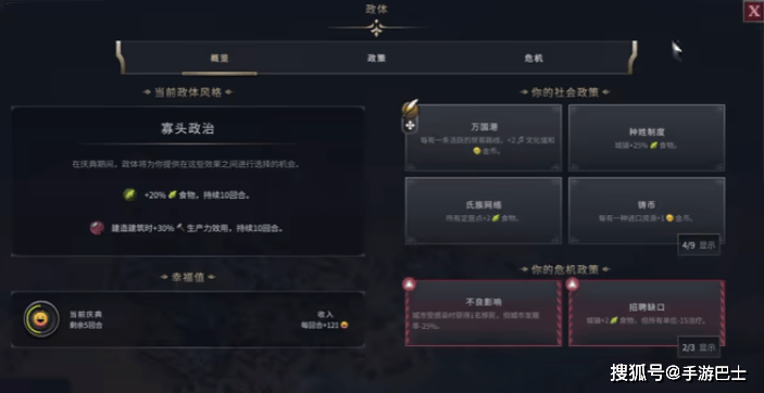 社会类 贫富差距、宗教冲突 城市忠诚度下降、幸福度归零、人口流失 政策(福利法案)、文化(意识形态统一)