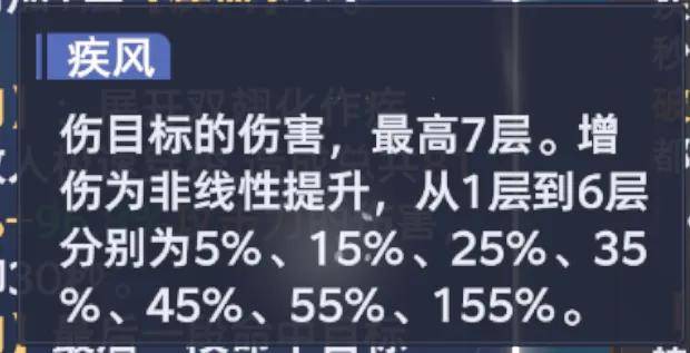 然后是3被动,这个被动主要的意义在于替换风笑天的常规先机技能,而替换后的“疾风连闪”先机技能则可以给风笑天施加“疾风”效果,那么“疾风”效果就是风笑天在长图中能越大越强的最核心依仗了,每30秒可以通过先机施加1层,最高可以叠加7层,让风笑天对重伤敌人的伤害有极高的增益,且这个伤害增幅非线性增加,说白了就是7层后可以有质变级别的提升。