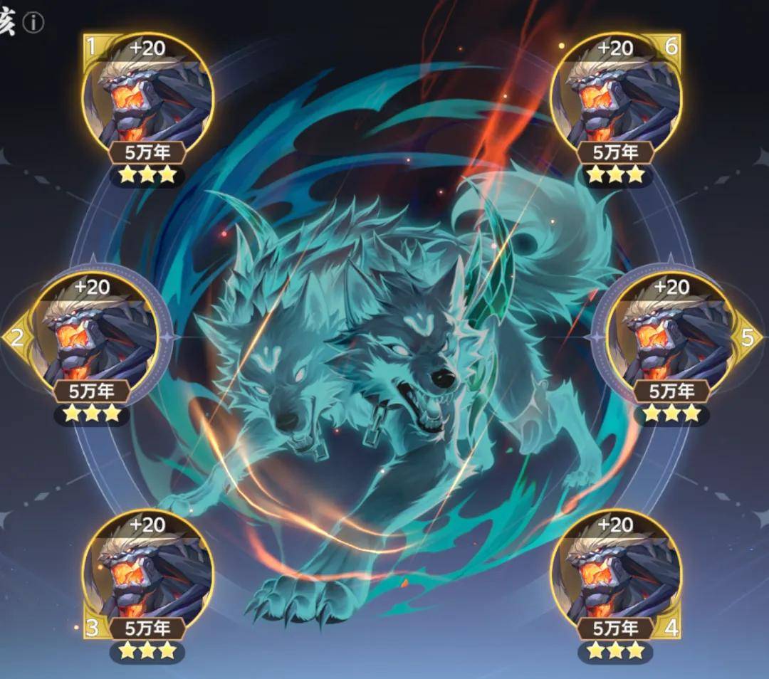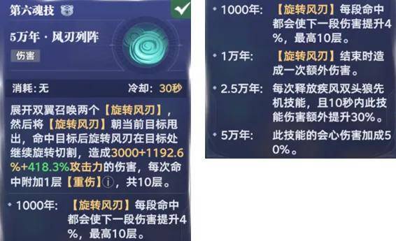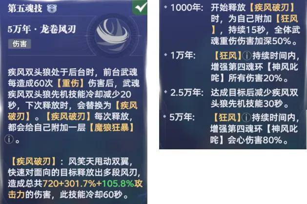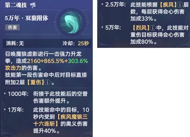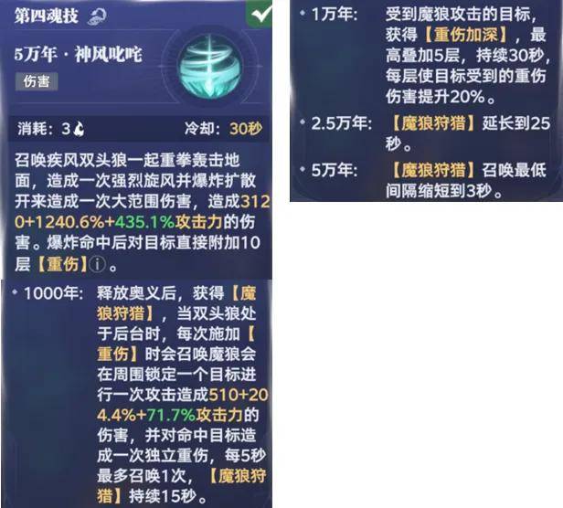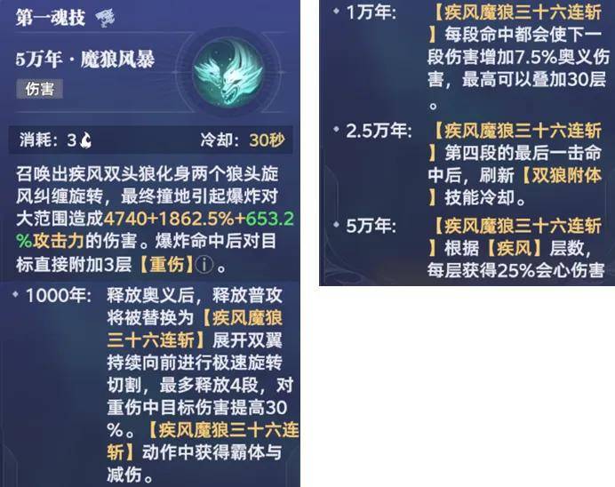 那么接着我们来分析下风笑天的技能,首先是主C打法下的123技能搭配,其1奥义简而言之就是召唤狼头进行攻击,非常简单粗暴的直伤技能,但其在魂环质变效果中有几点值得关注: