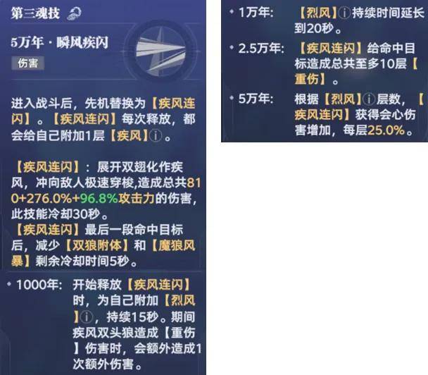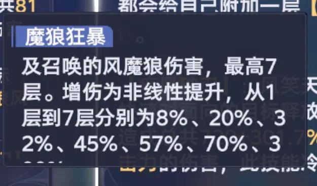 最后的5被动则是为了强化风笑天后台输出的一个被动,此被动也可以让风笑天的先机技能发生变化,同时会因前台主C触发的“重伤”伤害而出现增益效果,当然5被动里边最为核心的一个特点还是“魔狼狂暴”状态的积累,这个就有点类似于3被动里边的“疾风”状态了,可以大幅提升风笑天的伤害,也是一个需要通过长图积累慢慢叠到7层满层的状态。