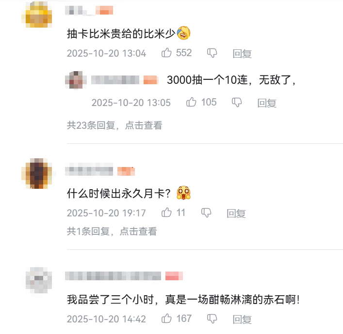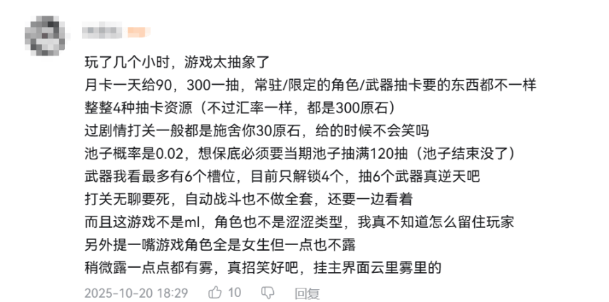 玩家们还发现,按直氪来算的话,一抽的价格高达24元(对比其它热门二游一抽6~16元左右),月卡全勤也只能勉强凑个10连,一个648只值不到30抽,可以说是把玩家当日本人在收钱了。