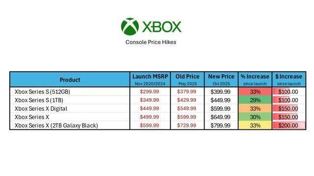 该消息传出前,微软已在年内两度上调Xbox主机售价——先后于5月及本月(10月)调整建议零售价。这些调价举措旨在应对微软承受的巨大市场压力。此前,该公司一直以亏损策略销售主机,通过硬件亏损换取生态收益。受此影响,旗舰产品Xbox Series X当前零售价已达650美元,较发行价格上涨超30%。