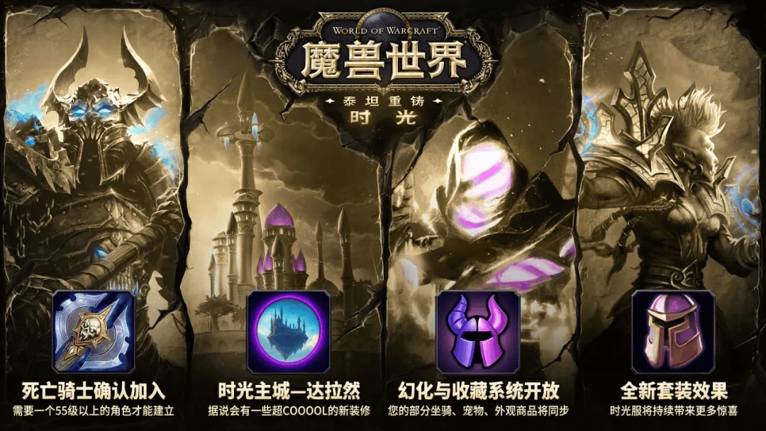 最后说一下主城达拉然和幻化收藏系统,部分怀旧服已经获得的坐骑也将同步至时光服,但幻化的装备估计要重新收集。另外,达拉然会新增一个雕塑,用来查看当前开放的副本阶段,大概是从60-80级版本的所有副本里抽取?官方对此并没有说明。
