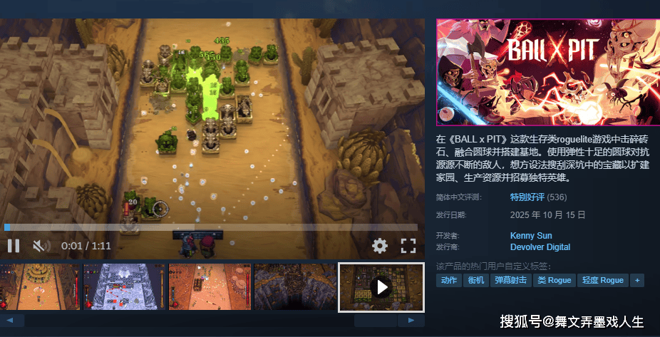 《球比伦战纪》原版名称《BALL×PIT》,由Kenny Sun制作、Devolver Digital发行,是一款快节奏的奇幻肉鸽游戏。发布时间为2025年10月15日,登陆平台包括PC、PS5、Xbox Series X|S和Switch等。游戏过程中,玩家需要控制手中的角色,在枪林弹雨中发射弹珠来抵御不断涌入的敌人。
