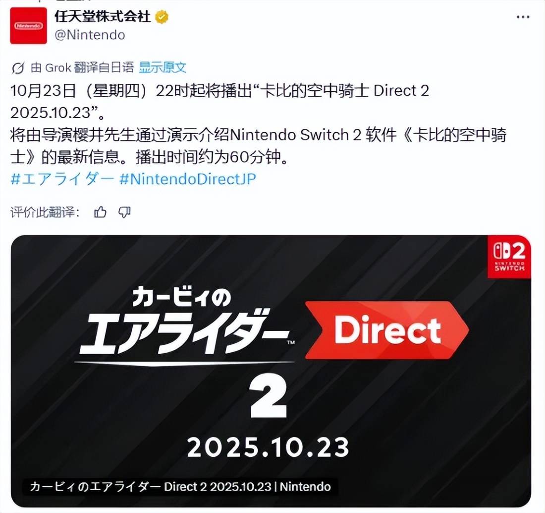 任天堂宣布,将于10月23日举办新一期直面会,主要介绍Switch2游戏《星之卡比:空中骑士》,时长约为60分钟。