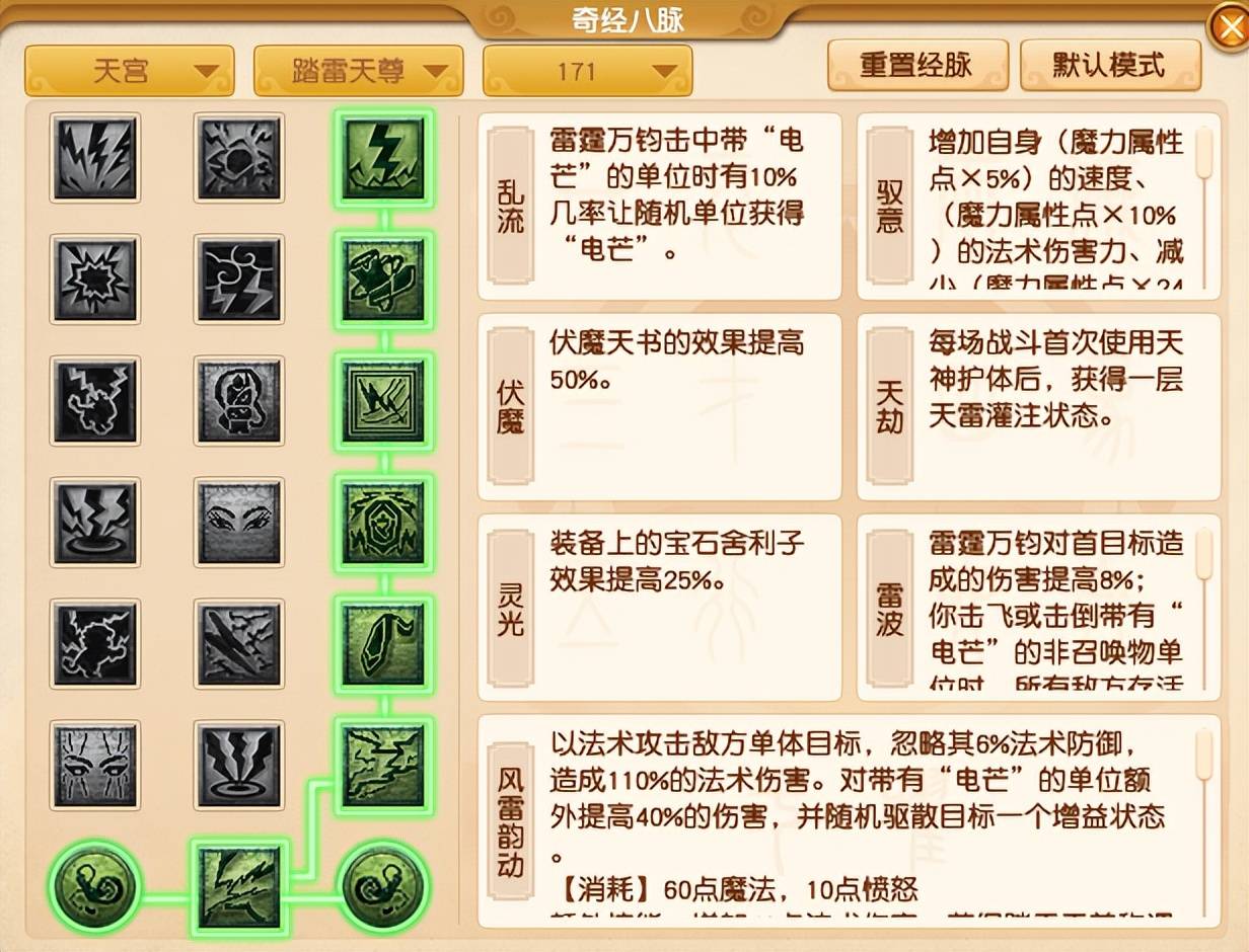 天宫目前主流的玩法为魔天宫,任务流派推荐选择【踏雷天尊】,经脉推荐采用“2222221”的点法。这样的点法不仅可以配合“天神护体”套开局秒六,还拥有较为稳定的输出。如果你想打爆发的话,将第五排的经脉换成第二列的“紫电”即可。