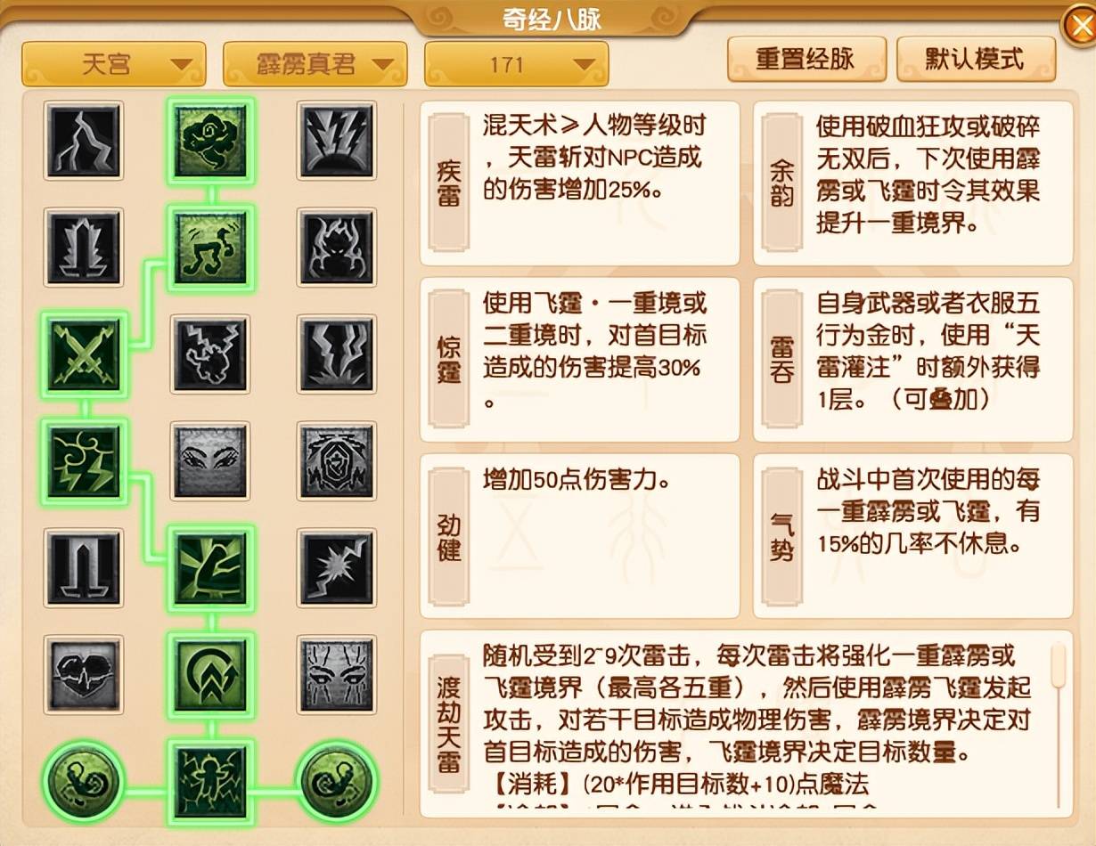 这样点技能获得天雷斩对NPC的伤害加成,也能特技提升霹雳或雷霆的境界。毕竟,力天宫刷任务,肯定还是要以拥有群秒属性的飞霆为主。需要注意的是,根据测试服力天宫的伤害来看,飞霆的伤害并不是理想,所以该流派到底能不刷任务,还有待开发。