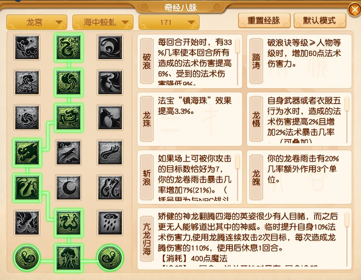 如果自身硬件较差的话,第一排的【破浪】并没有【狂浪】好,第四排的【龙慑】也不如【翱翔】。因此,经脉点法会变为“3232122”。不过,这么点的话会导致防御力偏低,各位小伙伴一定要注意。