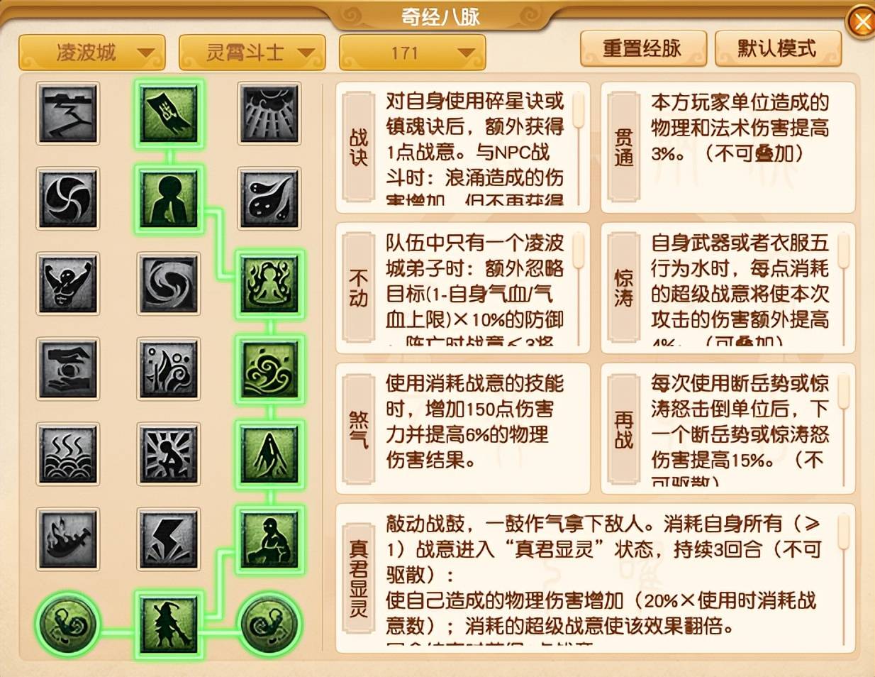 虽然凌波城三个流派都能刷任务,但由于【灵霄斗士】可以获得超级战意,所以在输出能力比其他两个流派要强,经脉方面推荐大家选用“2233332”的点法。这样不仅能提升任务输出能力,还可以增加超级伤害的伤害效果,刷任务非常舒服。