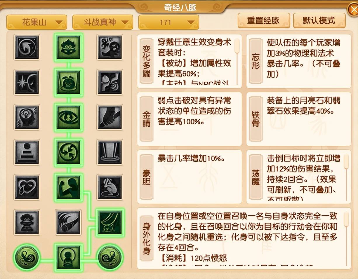 以法术输出为主的花果山玩家则需要使用重做后【通天法王】流派,该流派可以通过“窍”获得额外的法术暴击几率和法术伤害,经脉点法推荐“2211122”。这样的点法既可以确保一定的任务输出能力,还可以获得一定的爆发伤害,但具体效果如何还有待验证。