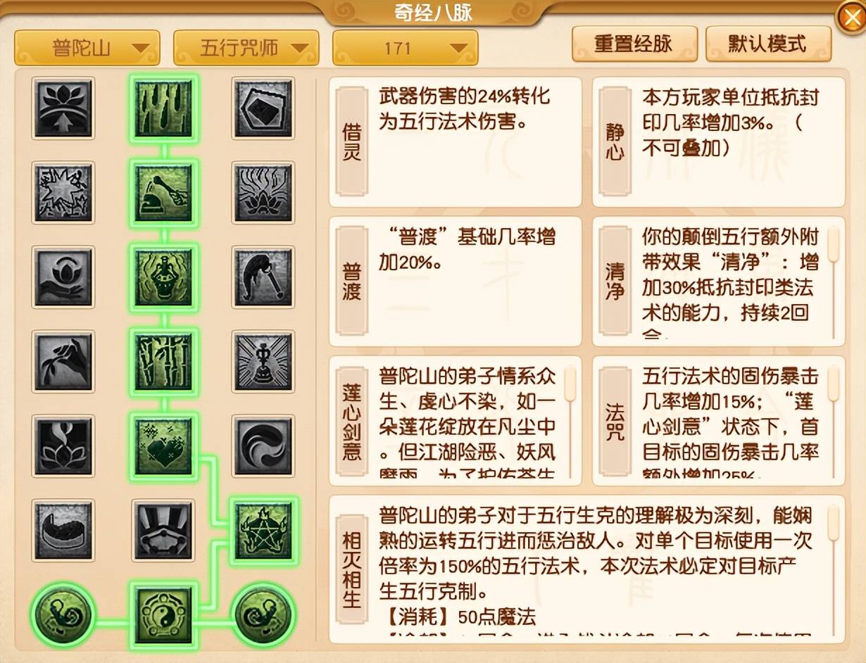 由于普陀山在本次门派中并没有太大的变化,所以依然推荐大家选择【五行咒师】流派刷任务,经脉推荐采用“2222232”的点法。这样点既可以提高普陀山的固定伤害,还能起到辅助队友的作用。
