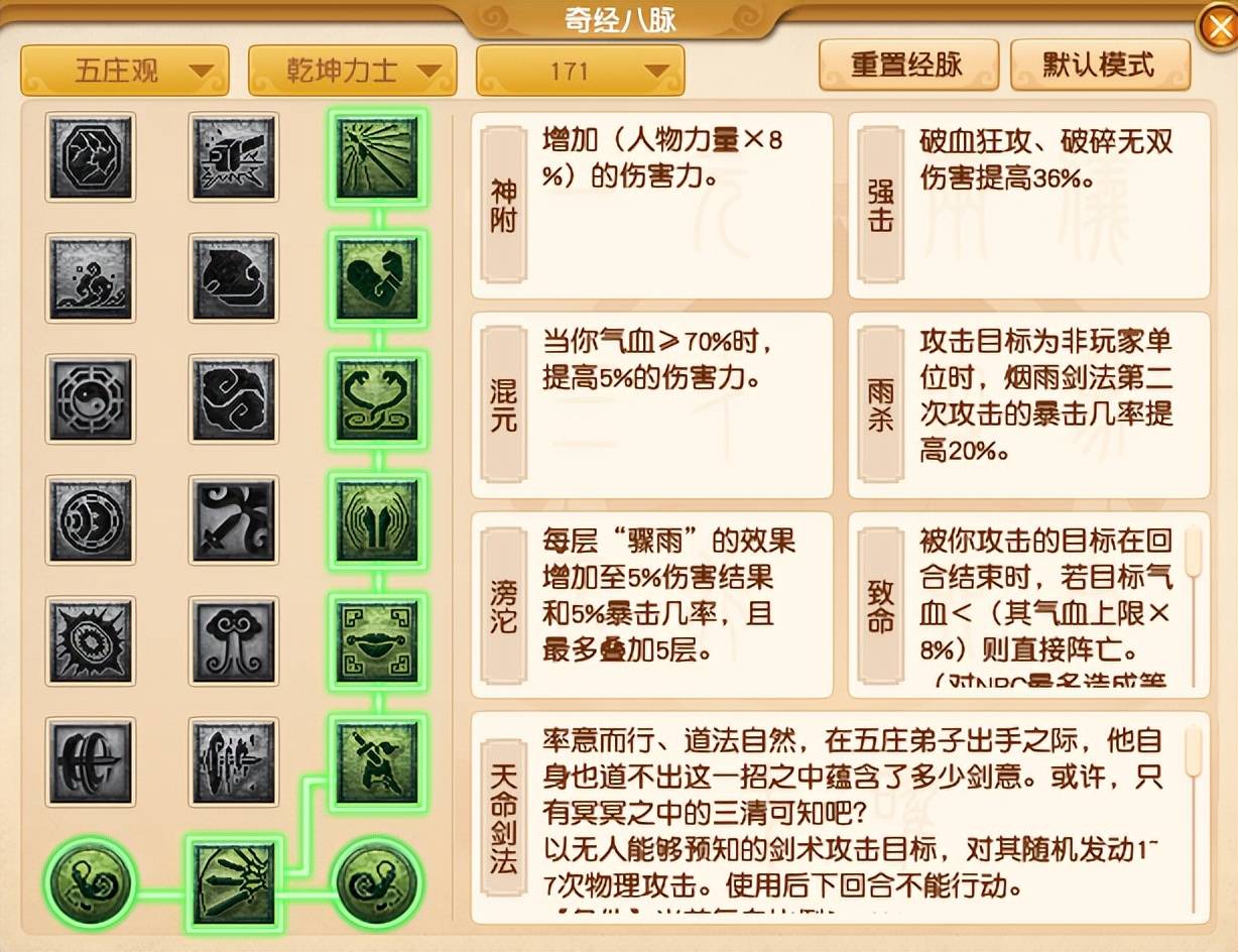 目前五庄观的玩法主要以“力五庄”为主,因此任务流派推荐【乾坤力士】,经脉点法为“3333332”。这套点法不仅可以最大化提升输出能力,还可以额外获得一定的暴击几率。可以说,只要配一把绝杀不磨武器,你的任务输出就变嘎嘎猛!