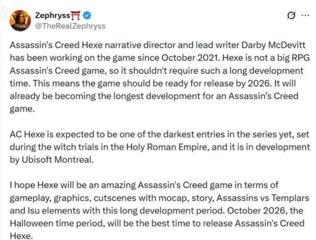据业内爆料人Zephryss透露,自2021年10月以来,育碧首席编剧兼创意总监Darby McDevitt一直全力开发新作《刺客信条:Hexe》,经过4年的努力,该作也即将迎来收官。
