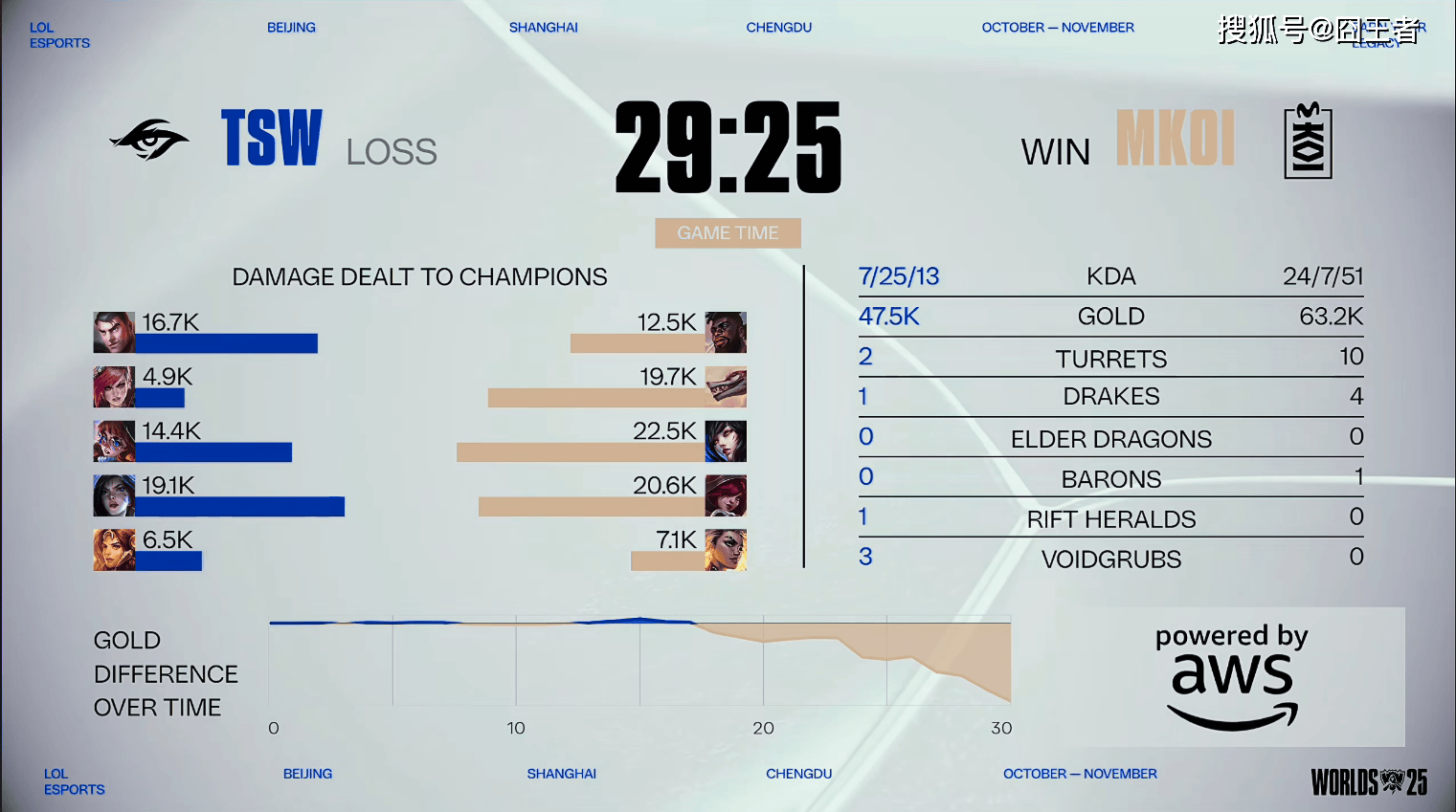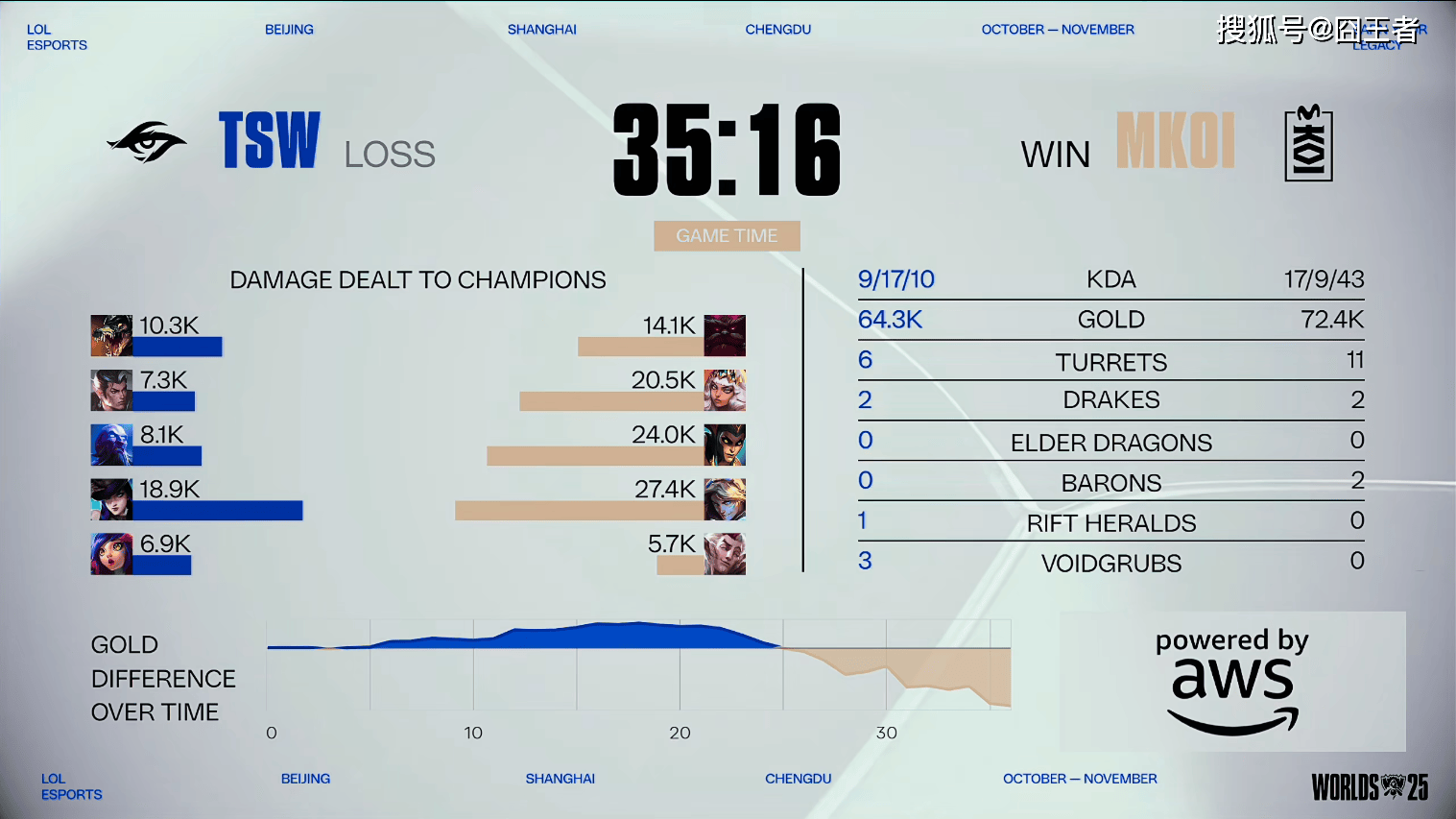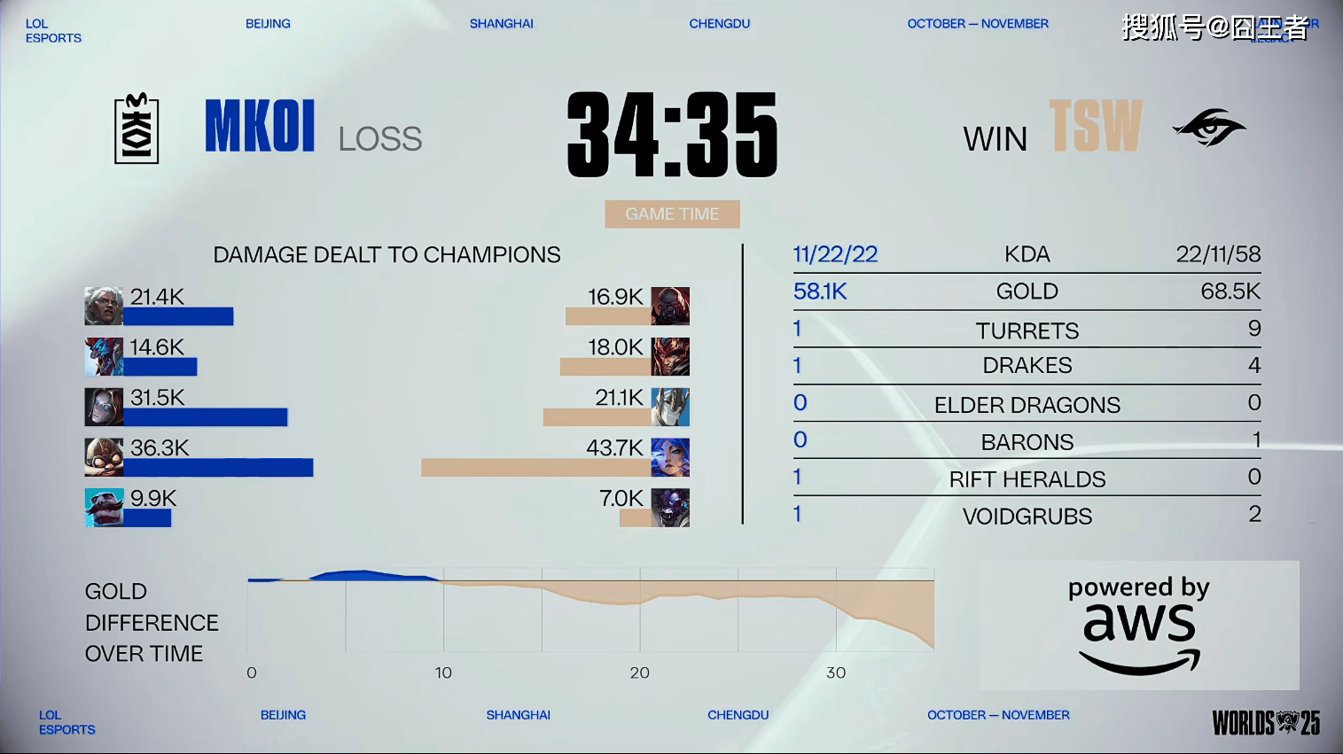 结果第一局比赛,MKOI只打好了,开头5分钟的比赛,后续比赛,全部成了TSW的表演时间。3分钟左右:ELyoya巨魔完美柱子卡住加里奥E,KOI中野打出0换2奠定优势;13分钟左右:双方AD中路对拼,飞机没蓝Eddie芸阿娜轻松完成对位单杀TSW彻底扳回劣势;17分钟左右:飞机再次被秒,KOI控下先锋但TSW强势追击团战大获全胜;20分钟左右:Jojopyun发条大拉到多人双杀挽救局势,KOI成功扳回一定劣势;25分钟左右:TSW成功拿下厄塔汗,随后团战双方打出1换1;29分钟左右:TSW完美分割战场逐个击破,连续击杀多人后控下龙魂和大龙;最终34分35秒,TSW团灭MKOI,先赢一局!