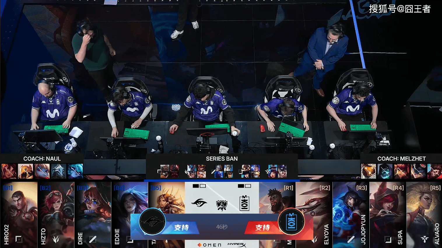 第一局比赛,KOI蓝色方,禁用:阿萝拉、蔚、奇亚娜、安妮、猴子,选用:Myrwn安蓓萨、ELyoya巨魔、Jojopyun发条、Supa飞机、Alvaro布隆;TSW红色方,禁用:瑞兹、岩雀、沙皇、妮蔻、波比,选用:Hiro02赛恩、Hizto皇子、Dire加里奥、Eddie芸阿娜、Taki牛头